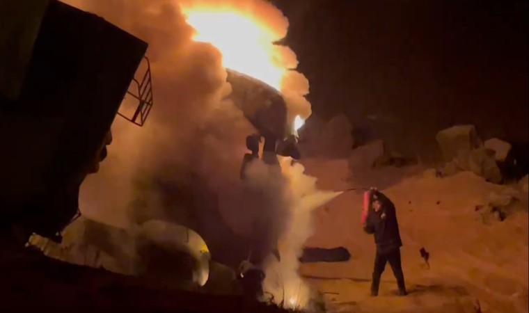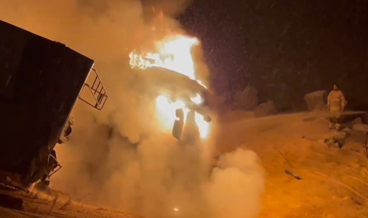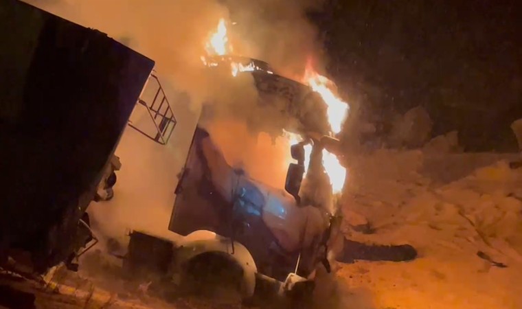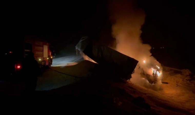 Kars’ın Sarıkamış ilçesinde hafif ticari araçla çarpışan tır, yoldan çıkarak yan yattı. Bir anda alev topuna dönen tırdan çıkan sürücü ise yanmaktan son anda kurtuldu.