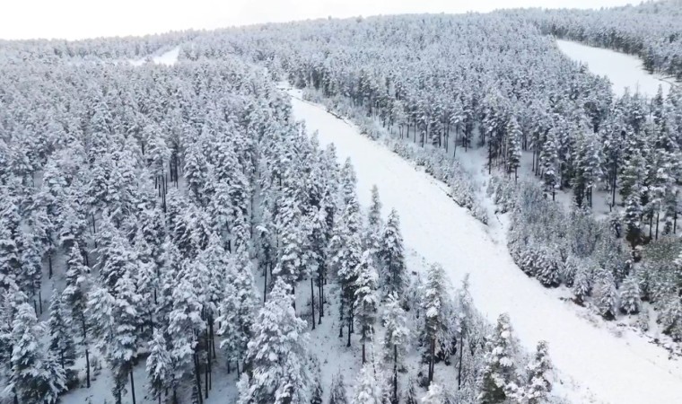 Sarıçam ormanlarında bulunan çam ağaçlarının da tamamen beyaz örtüyle kaplandığı ilçede soğuk hava rağmen kartpostal görüntüler ortaya çıktı.