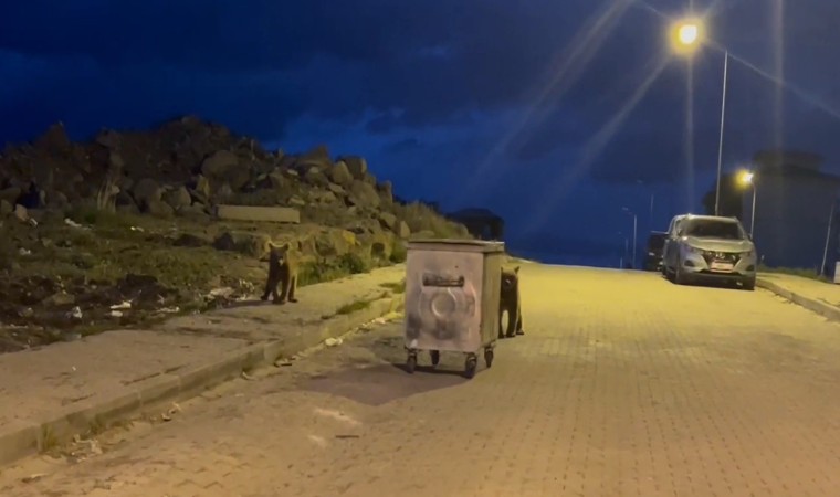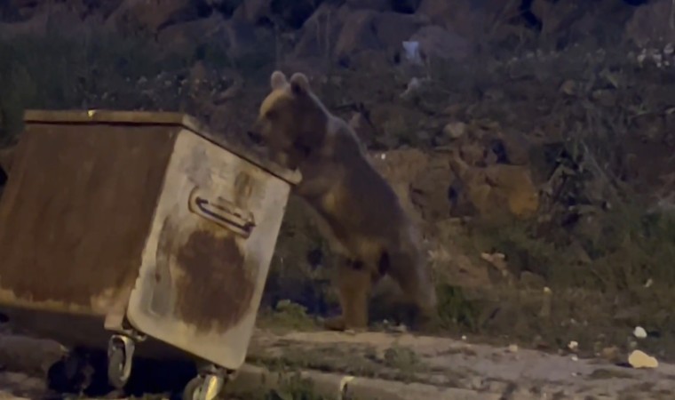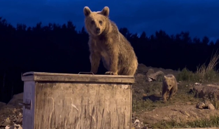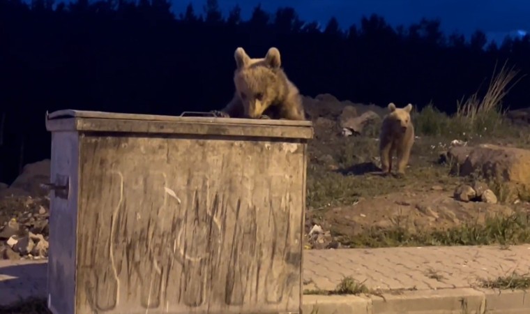 Yiyecek bulmak ve karınlarını doyurmak üzere ilçe merkezinde bulunan TOKİ lojmanlarına gelen 2 kafadar yavru ayı, kapağı kapalı çöp konteynerinin kapalı olan kapağını açmak için uzun süre mücadele etti. Yavru ayılar önce konteyneri itti, ardından üzerine çıktı. Bir türlü konteynerin kapağını açamayan yavru ayılar anbean kameralara yansıdı.