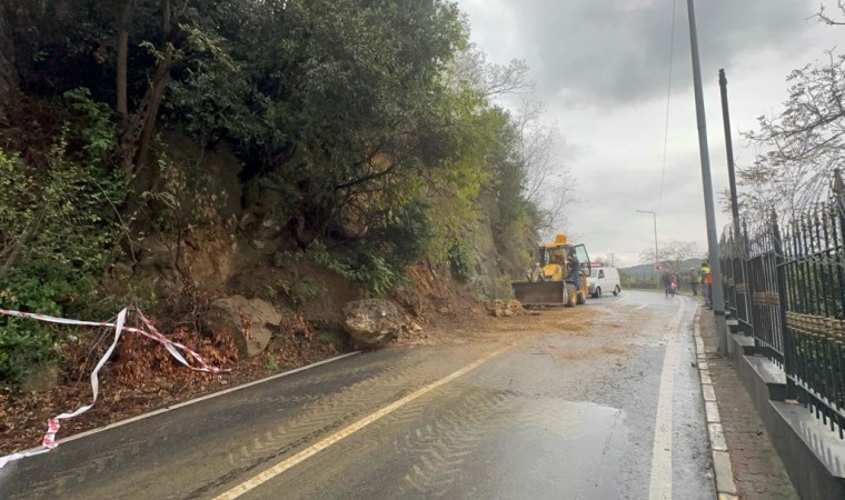 Sarıyer’de şiddetli yağmurun etkisiyle toprak kayması meydana geldi. Kaya parçalarının da düştüğü sırada yoldan araç geçmemesi muhtemel bir faciayı önledi.