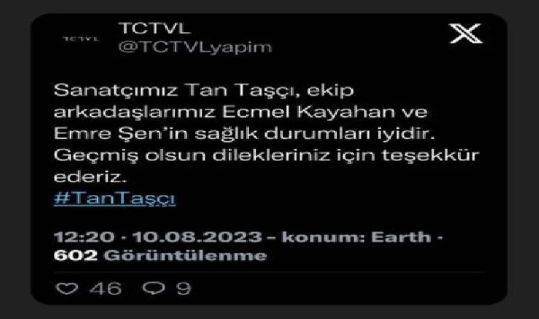 Tan Taşçı'nın yapım şirketi TCTVL Yapım, şarkıcının trafik kazası sonrasındaki sağlık durumuna ilişkin sosyal medya üzerinden açıklama yaptı. Açıklamada, "Sanatçımız Tan Taşçı, ekip arkadaşlarımız Ecmel Kayahan ve Emre Şen'in sağlık durumları iyidir. Geçmiş olsun dilekleriniz için teşekkür ederiz" denildi. Şarkıcı Tan da aynı açıklamayı sosyal medya hesabından paylaştı. Kaza sırasında sağ kolu incinen ve otelde dinlenen şarkıcının bugün saat 21.00'de Antalya'daki açık hava konserine çıkacağı açıklandı. (DHA)