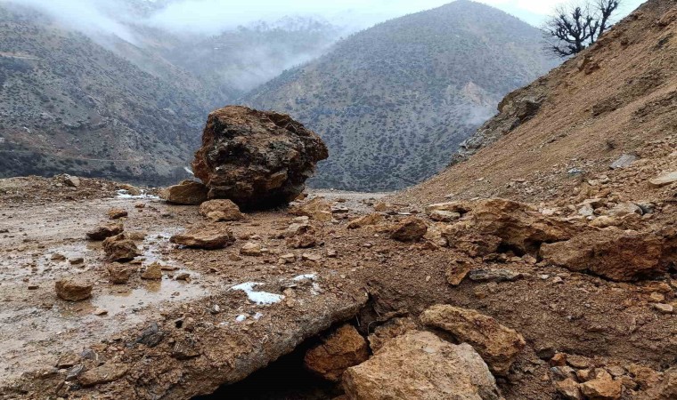 Batman’ın Sason ilçesinde yamaçtan kopan kaya parçaları köyü yolunu ulaşıma kapattı.