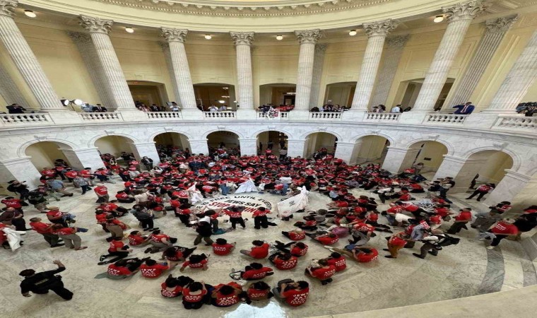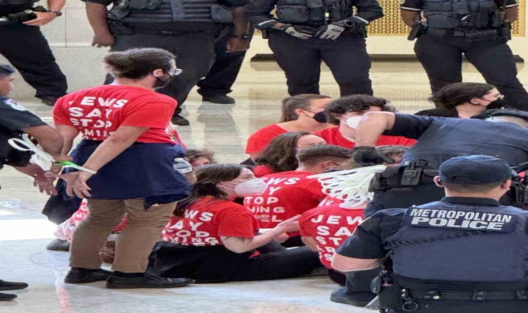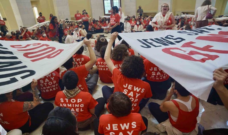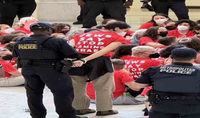 İsrail’in Filistinlilere yönelik saldırılarına tepki gösteren savaş karşıtı Yahudi göstericiler, ABD Kongresi’nde protesto gösterisi düzenledi. ABD hükümetine İsrail’e silah desteğini durdurma çağrısı yapan göstericiler polis tarafından gözaltına alındı.