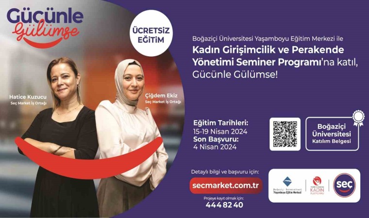 Seç Market, Boğaziçi Üniversitesi Yaşamboyu Eğitim Merkezi (BÜYEM) iş birliğiyle kadın girişimcileri desteklemek için geçen yıl başlattığı eğitim programının bu sene ikincisini gerçekleştiriyor. Gücünle Gülümse projesi kapsamında yürütülen “Kadın Girişimcilik ve Perakende Yönetimi Eğitim Programı”na başvurular 4 Nisan’a kadar devam edecek.