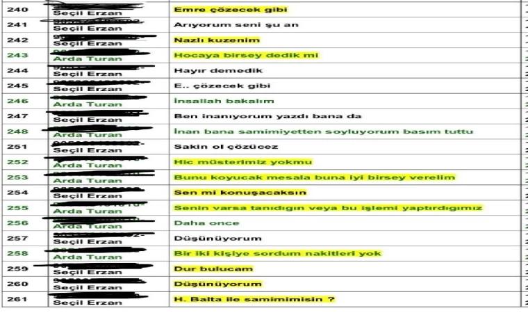 Mikail BIYIKLI/İSTANBUL,(DHA)- ÜNLÜ futbolcuları dolandırdığı gerekçesiyle tutuklanan DenizBank'ın şube müdürü Seçil Erzan'ın kırık cep telefonuna ait bilirkişi raporunda, Arda Turan'la arasında geçen bin 179 mesaj ortaya çıktı. Seçil Erzan'ın ödeme yapması konusunda kendisini oyaladığını iddia eden Arda Turan'ın, "Sana imzasız kayıtsız 15 milyon dolar nakit akışı sağladım. Bakmadan, karşılığına bak" şeklinde mesaj atması dikkat çekti. Turan'ın eşine çanta alması için Seçil Erzan'dan kredi çıkarması konusunda mesajlaşmaları da raporda yer aldı. Öte yandan Seçil Erzan'ın Fatih Terim'in eşi Fulya Terim ile de mesajlaşmaları ortaya çıktı. Fulya Terim'in Erzan'a, "24.01.2023 tarihinde 1 adet 16.000,00 USD tutarında döviz satış işleminiz gerçekleşmiştir. Seçil'cim selam böyle bir mesaj geldi" diye mesaj atması üzerine cevap olarak Seçil Erzan'ın, "Sizin hesabına gönderttim Fulya Hanım arada böyle parça parça sürprizlerimiz olabilir :)" şeklinde karşılık verdiği tespit edildi.