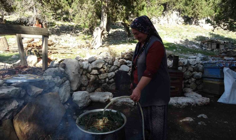 Aladağ ilçesinde pandemi ile sedir kozalağı şurubu üretimine başlayan Beyhan Tuğ, öksürük ve astım rahatsızlığının iyileşmesiyle başladığı sedir kozalağı şurubunu hem sağlığı için tüketiyor, hem de talep oldukça satarak evine ek gelir sağlıyor.