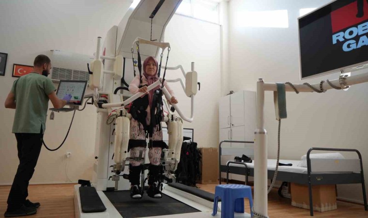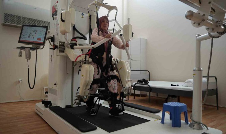 Barre Sendromu’na yakalanan Fatma Şahin, felçli geldiği Bolu İzzet Baysal Fizik Tedavi ve Rehabilitasyon Eğitim ve Araştırma Hastanesi’nde ‘Robot Destekli Yürüme Sistemi’ sayesinde ilk adımlarını atmaya başladı.