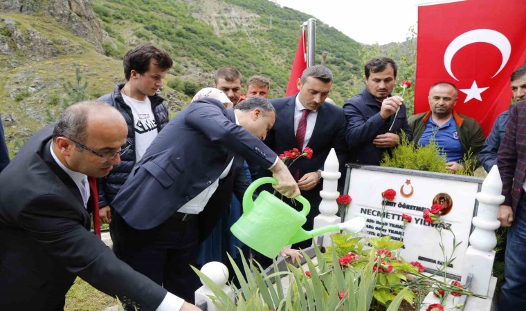 Gümüşhane’nin Torul ilçesine bağlı Demirkapı köyünde bulunan kabri başında düzenlenen anma programında 23 yaşında şehit edilen sınıf öğretmeni Necmettin Yılmaz’ın kabrine karanfil bırakılarak, dua edildi. Şehit öğretmenin annesi Gülay, babası Hamit, kardeşi Yahya ve ağabeyi Ahmet Yılmaz’ın da hazır bulunduğu törende şehit öğretmenin kabrine karanfil bırakıp dua eden Gümüşhane Valisi Kamuran Taşbilek, tek gayesi milletin evlatlarının aydınlanması olan ve bu uğurda mücadele ederken şehit edilen şehit öğretmen Necmettin Yılmaz başta olmak üzere vatanı, milleti, bayrağı, mukaddesatı uğruna mücadele eden aziz şehitler ve kahraman gazileri minnet, şükran ve rahmetle andıklarını söyledi.