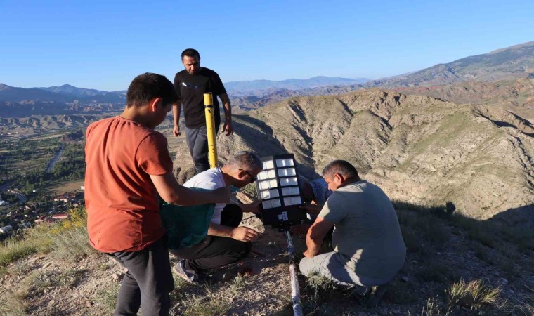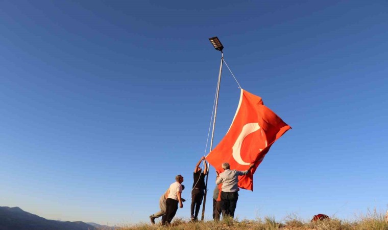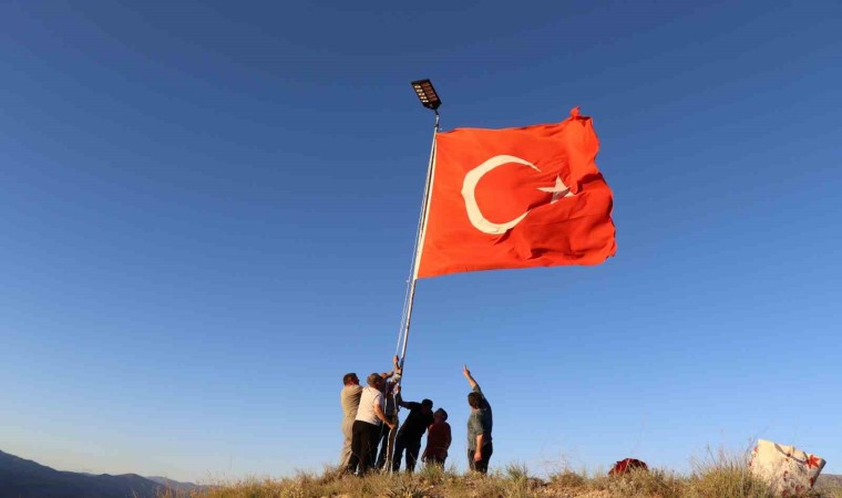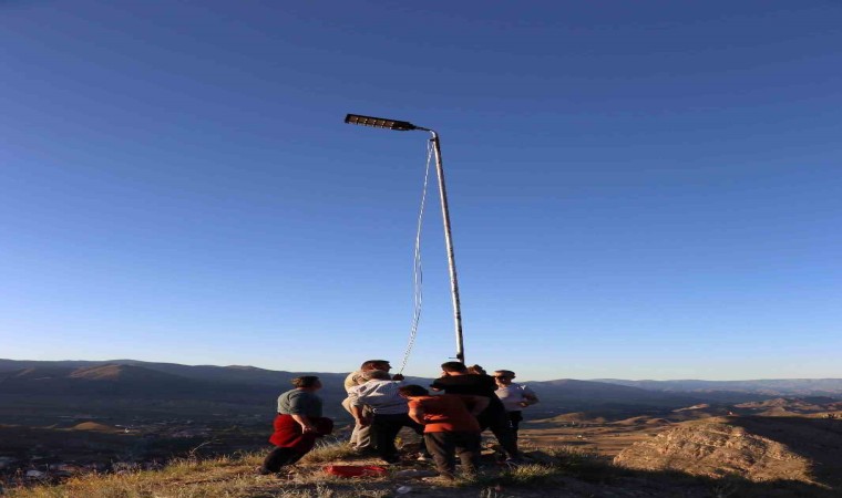 Oltu’nun Sitare Dağı’na şehit öğretmenler için diktikleri bayrak direğinin boyutunu uzatıp güneş enerjili lamba takarak aydınlattılar.