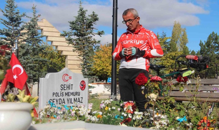 Kotluk, 2005 yılından beri şehitlerin anısına pedal çevirdiğini ifade ederek, “Şehit düştükleri noktalardan mezarlarına pedal çeviriyorum. İstanbul’da görev yaparken bir saldırgan tarafından şehit düşen Şeyda Yılmaz’ın anısına ’Şehitlere Vefa Pedalı Bisiklet Turu’nda 9 günlük yolculuk sonrası bugün Sivas Polis Şehitliği’ndeyim. Yolculuk boyunca Sivas Emniyet Müdürlüğü’ne ve tüm emniyet teşkilatına yolculuk güvenliğimi sağladıkları ve yanımda oldukları için teşekkürlerimi sunuyorum. Şehitliğimizi ziyaret ettik. Emniyet Müdürlüğümüze tüm şehitlerin hatırasına şanlı Türk bayrağımızı teslim ettim. Ailesine de bayrağımızı teslim ettim. Tüm şehitlerimizin ruhları şad, mekanları cennet olsun” dedi.