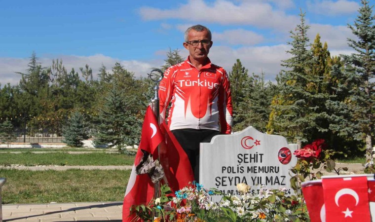 Bisikletçi Orhan Kotluk, şehit polis Şeyda Yılmaz anısına İzmir’den başlattığı bisiklet yolculuğunu Sivas’ta noktaladı. “Şehitlere Vefa Pedalı” sloganıyla 9 gün süren bin kilometrelik bu anlamlı yolculuk, Sivas Polis Şehitliği’nde son buldu. Polis ekiplerinin eşliğinde şehitliğe giden Kotluk, şehit Şeyda Yılmaz’ın mezarını ziyaret etti. Okunan duaların ardından yanında getirdiği Türk bayrağını Sivas İl Emniyet Müdürlüğü’nde görevli kadın komisere takdim eden Kotluk, daha sonra şehit polisin ailesini ziyaret etti. Yılmaz’ın anne ve babasıyla bir araya gelen Kotluk, aileye başsağlığı dileyerek, baba Mehmet Yağlı’ya Türk bayrağı hediye etti.