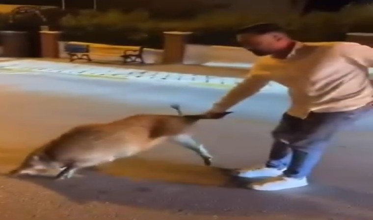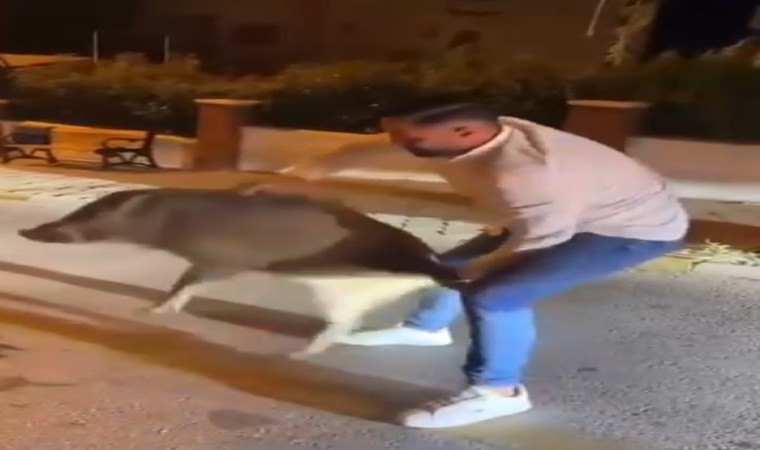 Aydın’ın Kuşadası ilçesinde şehre inen domuzları gören bir kişi, arka ayağından yakaladığı domuz ile adeta dalga geçti.