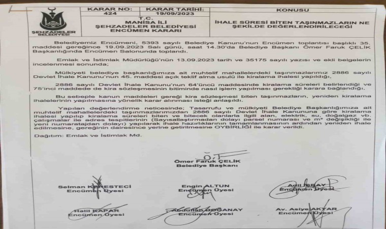 Ömer Faruk Çelik başkanlığında 19 Eylül 2023 tarihinde yapılan Encümen Toplantısı’nda belediye taşınmazlarının kira ihalesinin yapılması için oybirliğiyle alınan karar, yeni yönetimle birlikte uygulanmaya başlandı. Önceki dönem Encümen’in aldığı kararı uygulayan yeni yönetim, kira sözleşmesi biten ve bitecek olan belediyenin taşınmazlarındaki kiracılara, yapılacak olan ihale ile ilgili tebligatlar göndermeye devam ediyor.