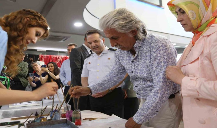 Protokol üyeleri sergide yer alan eserler hakkında öğretmen ve usta öğreticilerden bilgi aldı. Şehzadeler Kaymakamı Fatih Genel, workshop yapan Ebru öğretmeni Sibel Gürcü ile birlikte ebru çalışması yaptı.