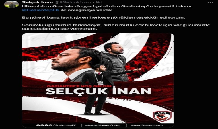 Gaziantep Futbol Kulübü, Teknik Direktör Selçuk İnan ile 1.5 yıllık mukavele imzaladı. İmza sonrası ilk açıklamalarını sosyal medya hesabı üzerinden yapan İnan, "Ülkemizin mücadele simgesi şehri olan Gaziantep’in kıymetli takımı Gaziantep FK ile anlaşmaya vardık. Bu görevi bana layık gören herkese gönülden teşekkür ediyorum. Sorumluluğumuzun farkındayız, sizleri mutlu edebilmek için var gücümüzle çalışacağımıza söz veriyorum" ifadelerini kullandı.