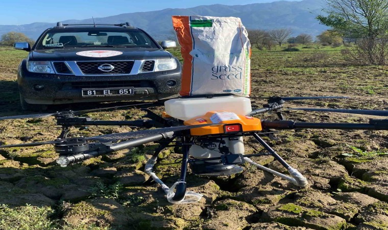 Düzce İl Tarım ve Orman Müdürlüğü, teknoloji ile maliyetten ve zamandan tasarruf ederek zarar gören meralara dron ile tohum ekimi yapıyor.