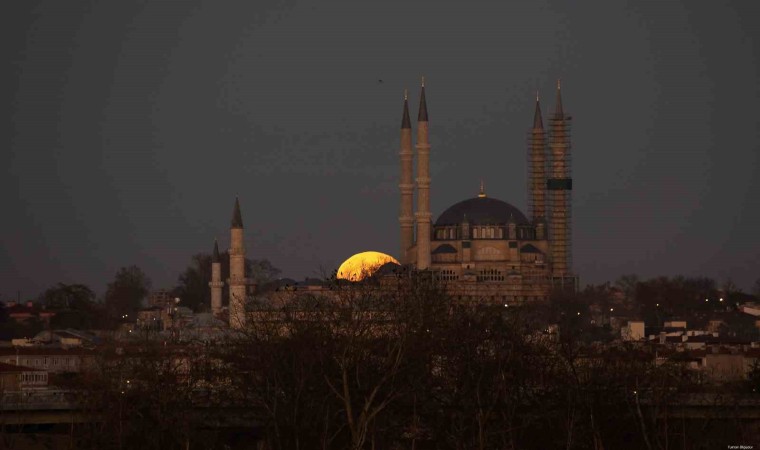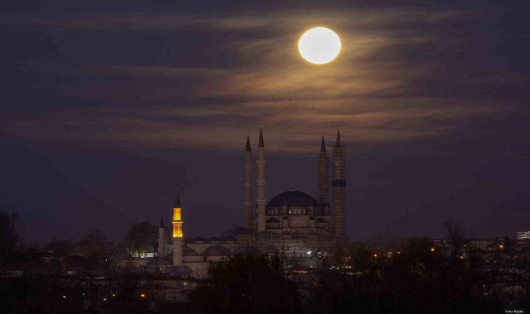 Edirne’de gökyüzünden beliren yılın son dolunayı ile Selimiye Camii’nin görüntüsü görsel şölen sundu.