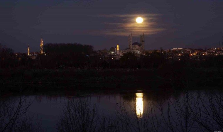 Edirne’de akşam saatlerinde gökyüzünde beliren 2023 yılının son dolunayı, Mimar Sinan’ın ustalık eseri Selimiye Camii ile birlikte görenleri hayran bırakacak görüntüler oluşturdu. Meriç Nehri’ndeki yakamoz ise manzarasıyla izleyenleri mest etti.