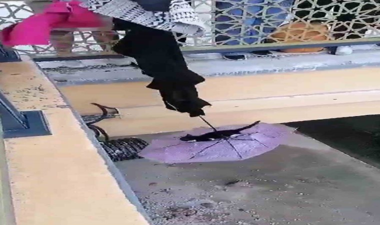 Tokat’ta dere kanarında mahsur kalan yavru kediyi vatandaşlar, birbirine bağladıkları kıyafetlerle aşağı şemsiye uzatarak kurtardı.