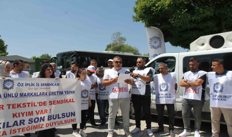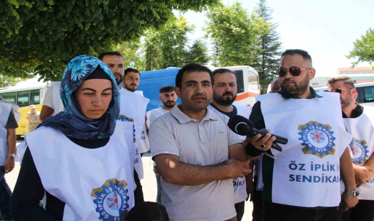 Hak-İş’e bağlı Öz İplik İş Sendikası yetkilileri sendikal faaliyetlerinin engellendiğini belirterek işten çıkarılan işçilerle birlikte fabrika önünde eylem yaptı.