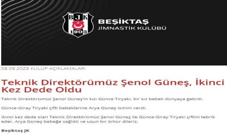 Beşiktaş Teknik Direktörü Şenol Güneş, ikinci kez dede olmanın sevincini yaşadı. 70 yaşındaki deneyimli teknik adamın kızı Günce ile damadı Giray, dünyaya yeni gelen kız bebeklerine Arya Güneş ismini verdi. Konuyla ilgili Beşiktaş’ın resmi internet sitesinden yapılan paylaşımda, "Teknik Direktörümüz Şenol Güneş’in kızı Günce Tiryaki, bir kız bebek dünyaya getirdi. Günce-Giray Tiryaki çifti bebeklerine Arya Güneş ismini verdi. İkinci kez dede olan Teknik Direktörümüz Şenol Güneş ile Günce-Giray Tiryaki çiftini tebrik eder, Arya Güneş bebeğe sağlıklı ve uzun bir ömür dileriz" denildi.