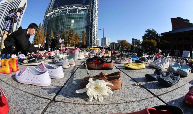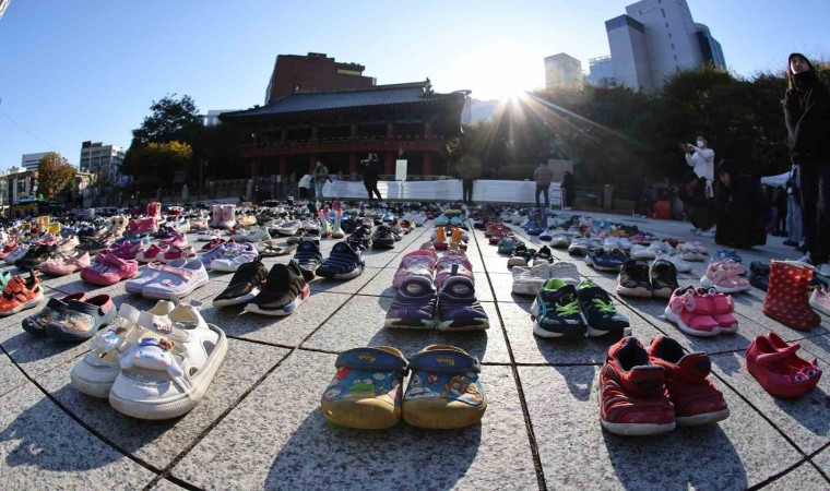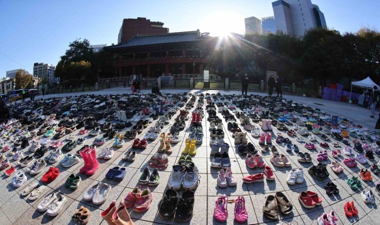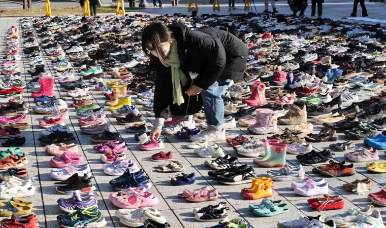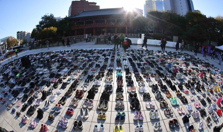 Güney Kore’nin başkenti Seul’deki bir meydana İsrail’in saldırıları sonucu Filistin’de hayatını kaybedenler için 2 bin çift ayakkabı dizildi.