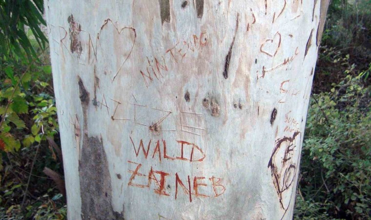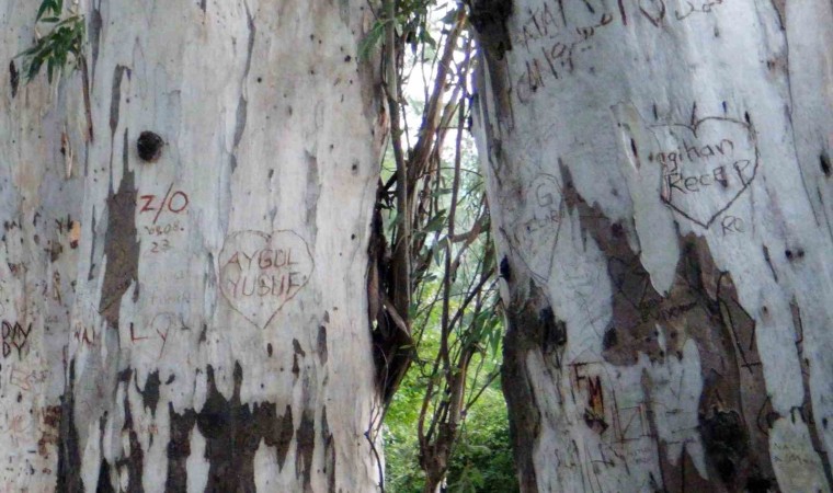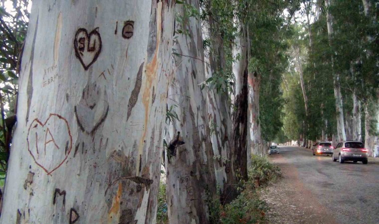 Muğla’nın Ula ilçesine bağlı Gökova Körfezi’ne kıyısı bulanan Akçapınar Mahallesi’nin girişindeki 86 yıllık okaliptüs ağaçları yerli ve yabancı turistlerin ağaçların gövdesine kesici aletler ile aşk mesajları yazması nedeniyle ’ilanı aşk tahtası’na döndü.