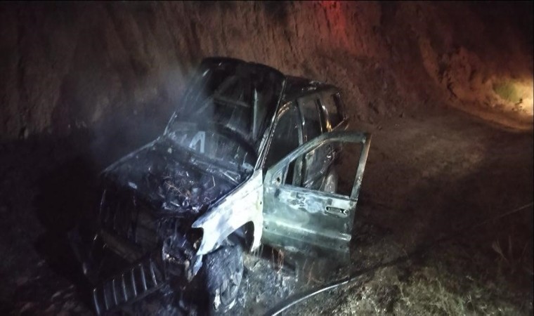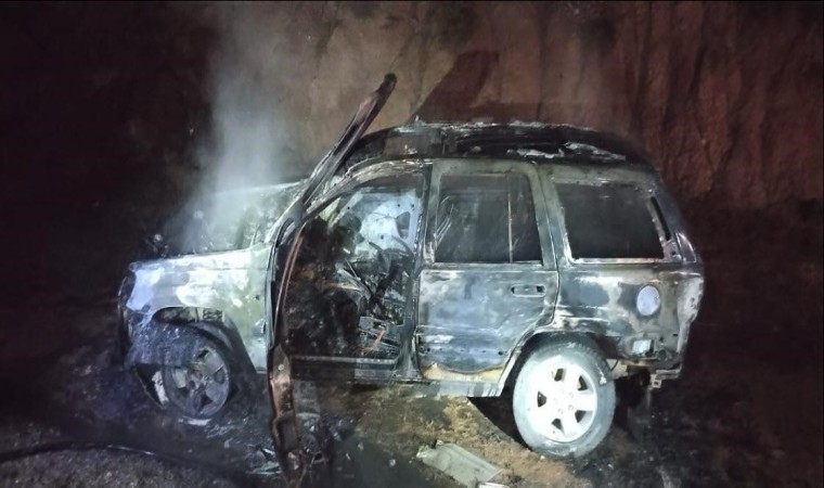 Karabük’te seyir halindeyken alev alan cip, demir yığınına döndü.