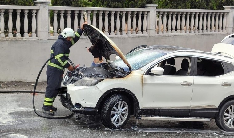 Hatay’da seyir halindeyken motor kısmı alev alan cipte hasar oluştu.