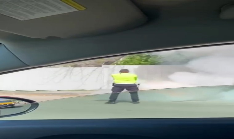 Bursa’da seyir halindeki motosiklet alev alev yanarken, yangına ilk müdahaleyi tesadüfen olay yerinden geçen trafik polis ekibi yaptı.