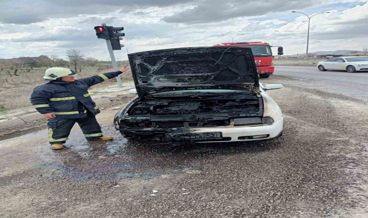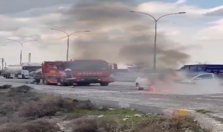 Konya’nın Karapınar ilçesinde seyir halindeyken alev alan otomobil, itfaiye ekiplerince söndürüldü.