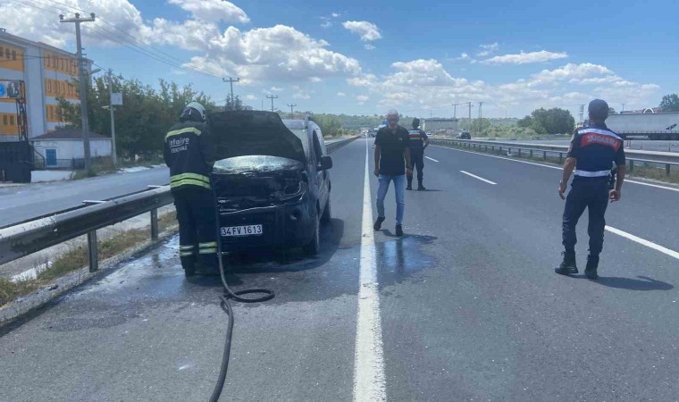 Tekirdağ Çorlu’dan Çerkezköy’e seyir halinde olan hafif ticari araç, Veliköy 1. Işıklar mevkiinde motor kısmından alev aldı.
