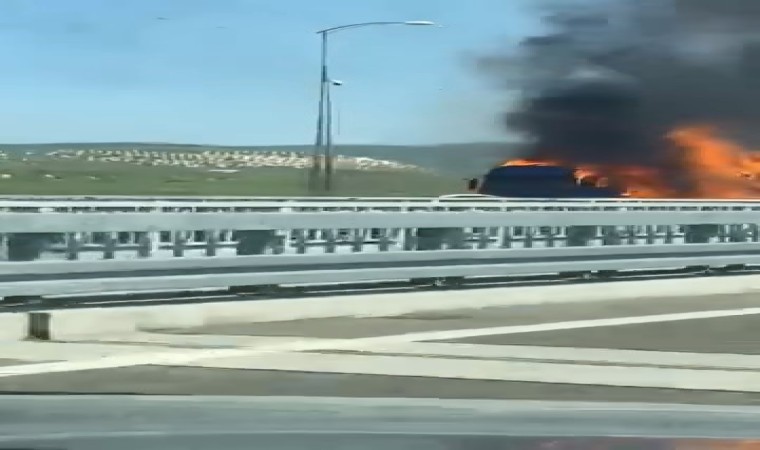 Bursa’da seyir halindeki tır çıkan arıza sonrası alev alev yandı. O anlar kameraya yansırken, tır kullanılamaz hale geldi.