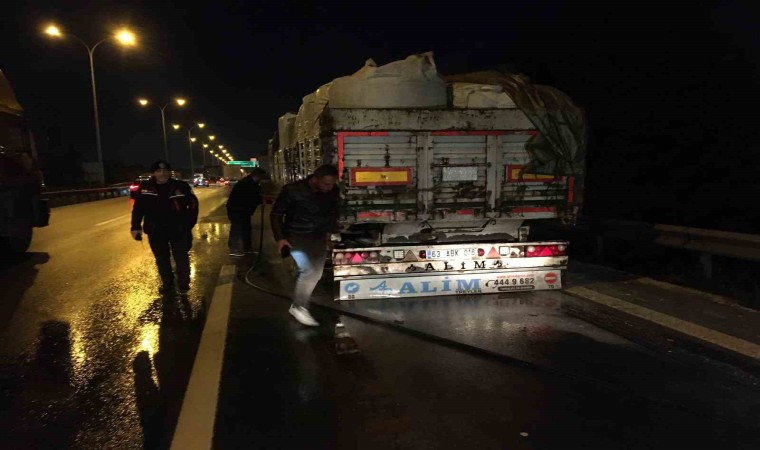 Olay, Körfez TEM Otoyolu Ankara istikametinde meydana geldi. Edinilen bilgiye göre, Mustafa Ş. yönetiminde seyir halinde olan 63 AEV 793 plakalı tırın lastiği alev aldı. Durumu fark eden sürücü hemen aracı durdurdu. Sürücü ve çevredeki vatandaşlar yangın tüpüyle alevlere müdahale ederken itfaiye ekiplerine de haber verdi. İhbar üzerine kısa sürede olay yerine gelen itfaiye ekipleri, yangını arabanın tamamına sıçramadan söndürdü. Yangın sebebiyle uzun araç kuyrukları oluştu. Polis olayla ilgili inceleme başlattı.