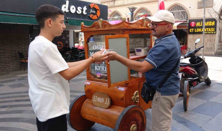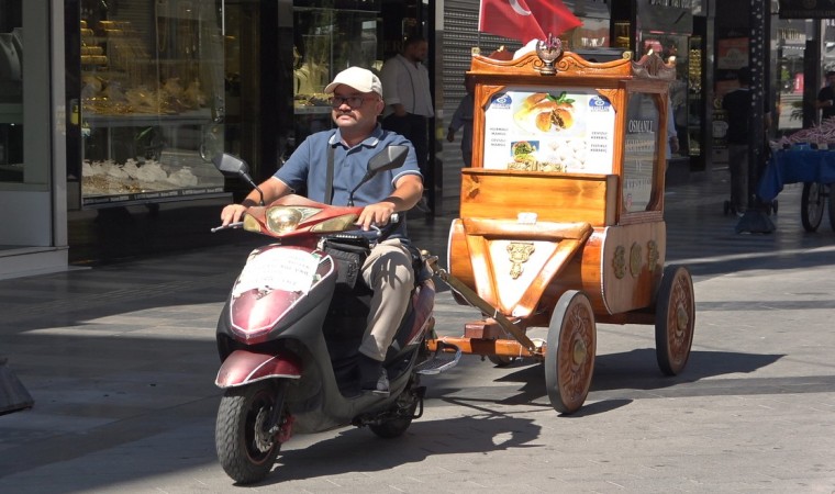 Mersin’de seyyar satıcılık yapan 43 yaşındaki Musa Tümer, gürgen ağacından yaptırdığı ’saltanat arabası’ benzeri tezgahıyla dikkat çekiyor. Tümer, eskilerden esinlenerek kendi tasarladığı tezgahta kerebiç tatlısı ve mamul satarak hem geçimini sağlamayı hem de çocuklarını okutmayı amaçlıyor.