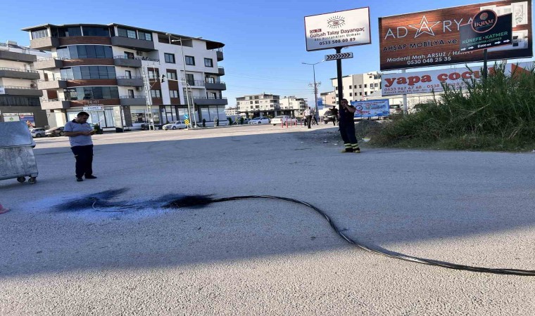 Hava sıcaklığının etkisini hissettirdiği Hatay’da hava sıcaklığı gün içerisinde 40 dereceyi buluyor. Sıcaklığın etkisiyle Arsuz ilçesi Karaağaç Mahallesi Uğur Mumcu Caddesi’nde üzerinde bulunan elektrik tellerinde genleşme yaşandı. Genleşmenin etkisiyle kopan elektrik tellerinde patlama yaşandı. Vatandaşları tedirgin eden patlama cep telefonu kamerasıyla görüntülendi. Elektrik hattında yaşanan arıza ekipler tarafından giderilerek mahalleye yeniden elektrik verildi.