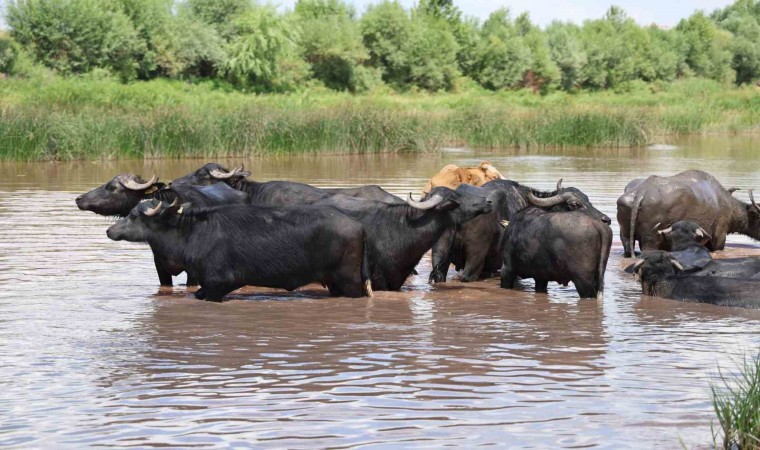 Hava sıcaklığının öğle saatlerde 30 dereceyi bulduğu Sivas’ta sıcak hava insanlar kadar hayvanları da etkiliyor. Kızılırmak kenarında otlayan mandalar sıcaktan etkilenince çareyi nehre girmekte buldu. Kalın ve siyah derileriyle bilinen mandalar Türkiye’nin en uzun ırmağı olan Kızılırmak’a girerek serinledi. Irmağın serin sularına kendilerini bırakan mandalar ortaya Afrika belgesellerini aratmayan görüntüler çıkarttı.