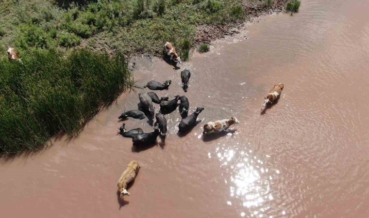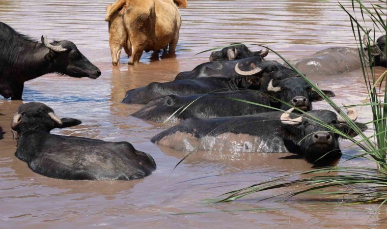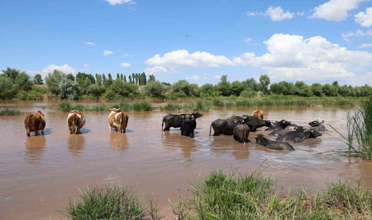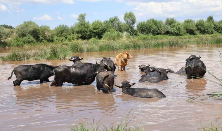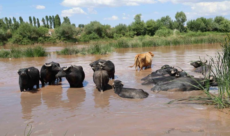 Sivas’ta mevsim normallerinin üzerinde seyreden hava sıcaklıkları mandaları da bunalttı. Serinlemek için sulak alan arayan mandalar çareyi Kızılırmak’ın serin sularında buldu.