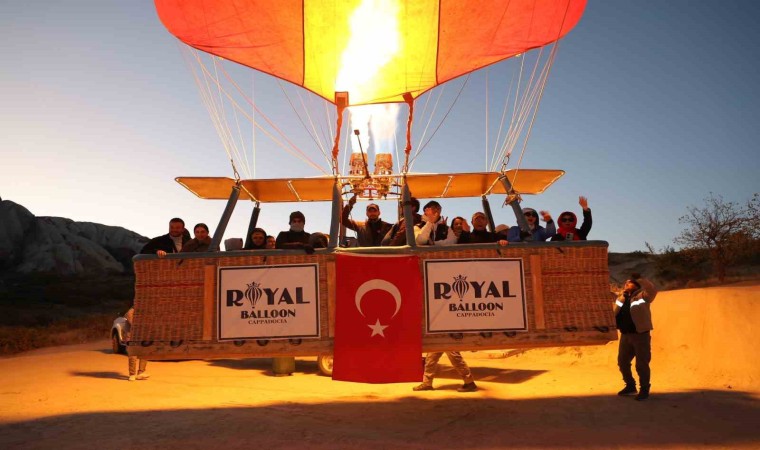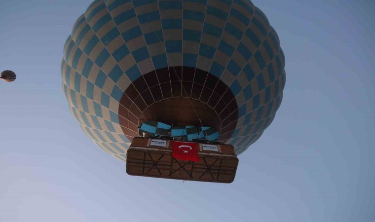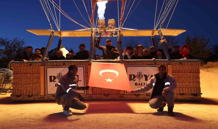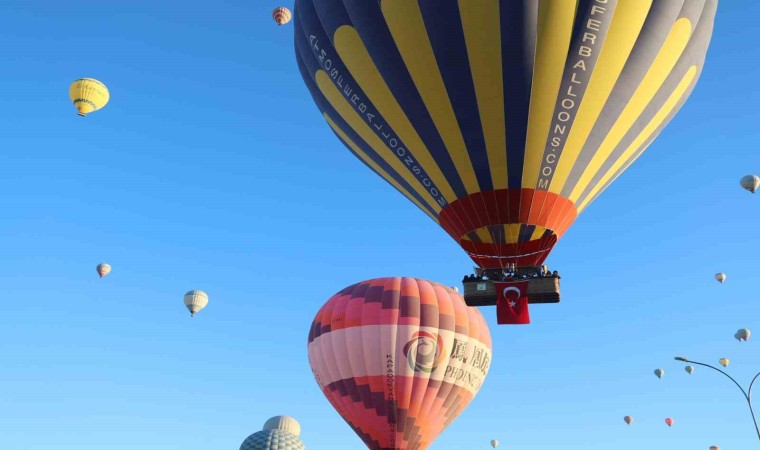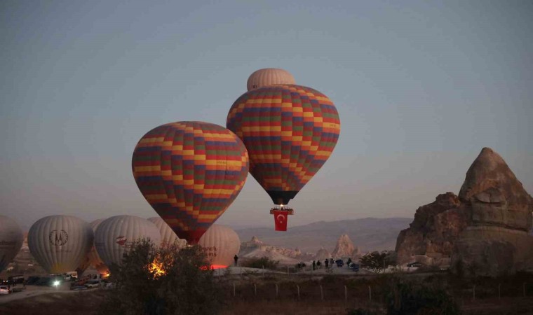 Nevşehir’in Göreme beldesinde, gün doğumundan önce uçuş için hazırlanan sıcak hava balonlarının sepetlerine, Türk Bayrakları ve Atatürk posterleri asıldı. Türk Bayrakları ile peş peşe gökyüzüne yükselen balonlar, bölgedeki peribacaları arasında fotoğraf çektiren yerli ve yabancı turistler için görsel şölen oluşturdu. Yaklaşık 1,5 saat Kapadokya semalarında dolaşan Atatürk posterli ve Türk Bayraklı sıcak hava balonları, güzel görüntüler oluşturdu.