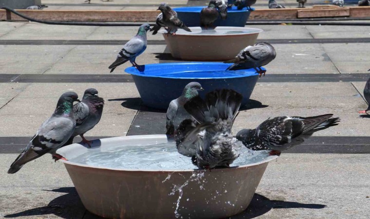 Sıcak havadan insanlar kadar hayvanlar da etkilendi. Ulu Cami avlusunu mesken edinen güvercinler ise leğenlere konulan sudan gerek içerek gerekse içine girerek serinlemeye çalıştı. Kimi güvercinler de ağaç gölgelerinde konakladı.