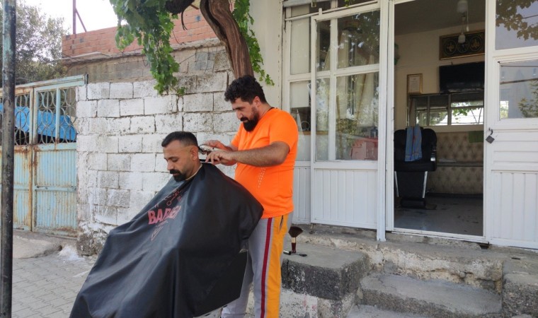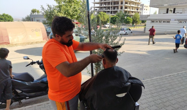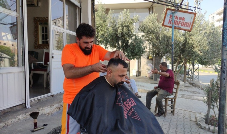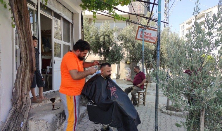 Yaşanan 6 Şubat depreminde evini ve aracını kaybeden berber Abdullah Kahramanlı, kapalı alan fobisi ve sıcakların 40 dereceleri bulduğu bugünlerde iş yerinin önüne düşen gölgede tıraş yaparak müşterilerini rahatlatmaya çalıştığını söyledi. Kahramanlı, "Eyyamıbahur sıcakları yakıp kavuruyor. İçeride klima yetersiz geliyor. Müşterimizin daha rahat ve daha serin tıraş olabilmesi için açık alana çıktık. Rüzgarın etkisi ile daha serin bir hava oluşuyor. Bu vesileyle müşteri de rahat ediyor hem de biz rahat ediyoruz" dedi.