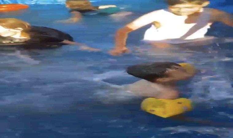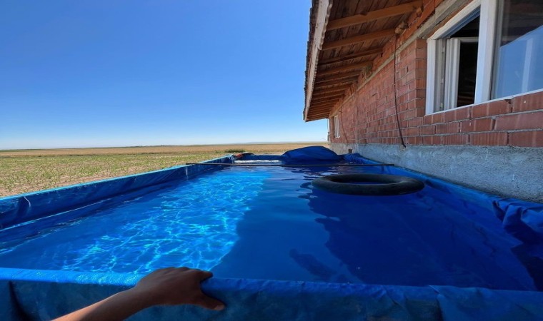 Eskişehir’de sıcaktan bunalan çiftçinin, içini kuyu suyuyla doldurduğu 4 tonluk römorkun içinde çocuklar keyifle yüzdü.