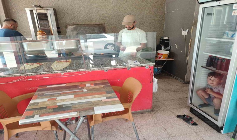 ADANA’DA DÖNERCİ USTASI BABASININ YANINDA DURAN BİR ÇOCUK SICAKTAN BUNALINCA BUZDOLABINDA SERİNLEDİ.