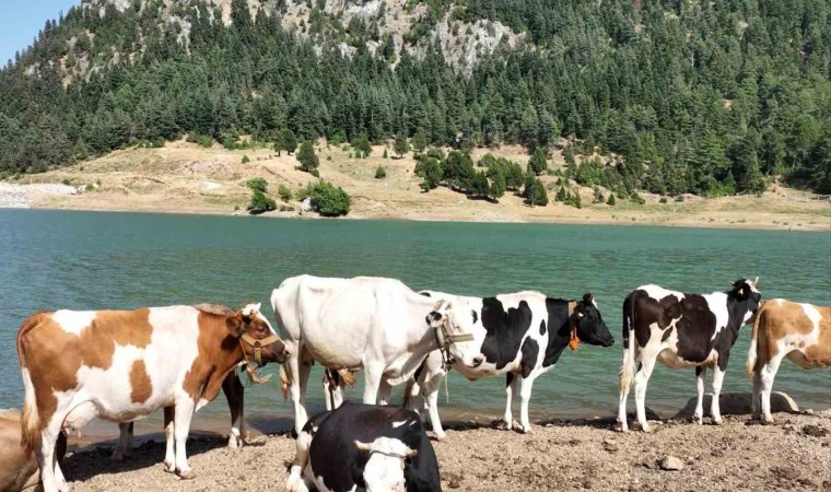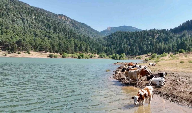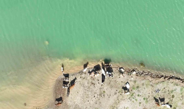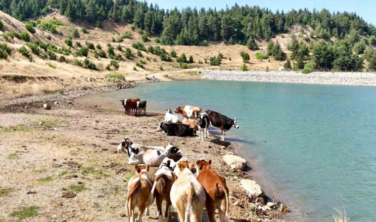 Şehir merkezine 47 kilometre uzaklıkta olan göletin etrafında otlayan inekler sıcak havada gölete girerek serinledi.