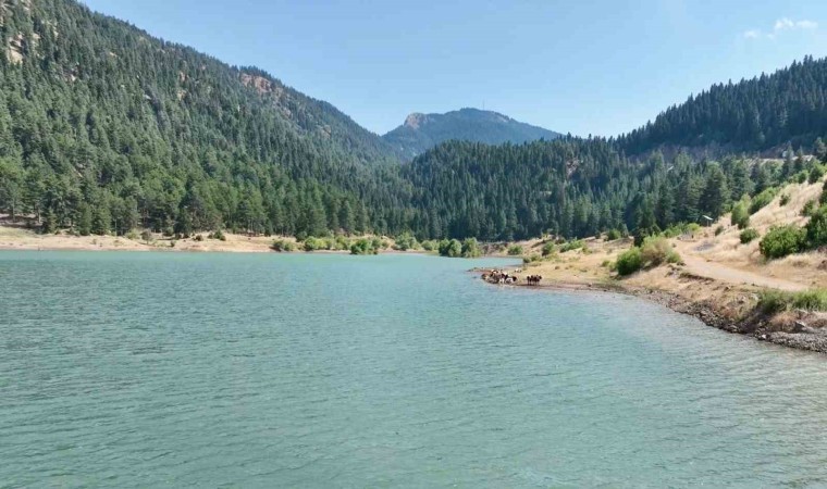 Onikisubat ilçesinde kamp yapmak isteyen doğaseverlerin uğrak mekanı haline gelen Meydan Göleti, sıcaktan bunalan ineklerin de vazgeçilmezi oldu.
