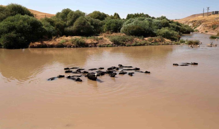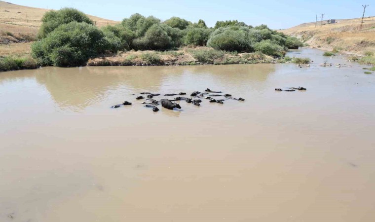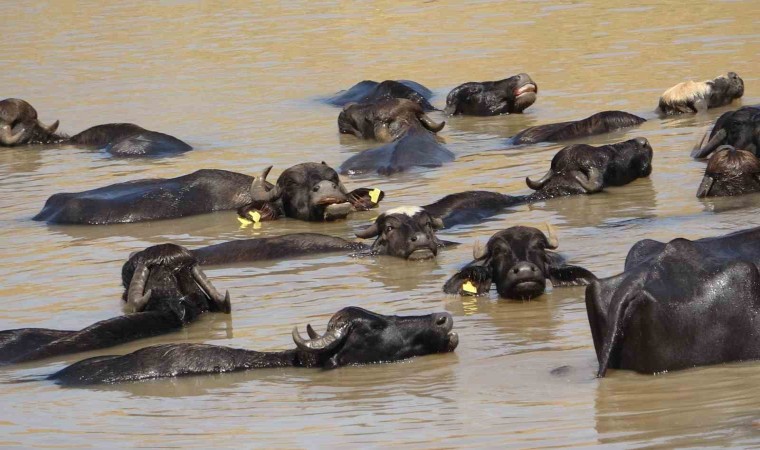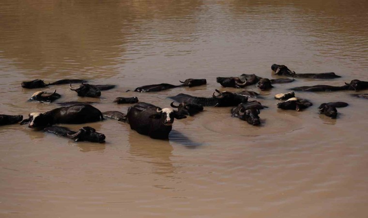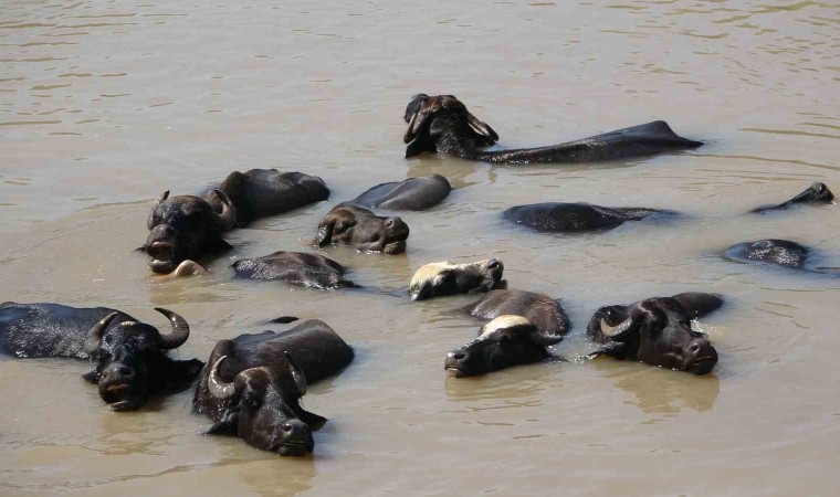 Merkez Bağlar ilçesi kırsal Tavşantepe Mahallesi’nde besici Hayvan Tek’in mandaları ise öğlen saatlerinden itibaren soluğu gölette alıp saat 15.00’ten sonra çıkarak tekrar otlatmaya götürülüyor.