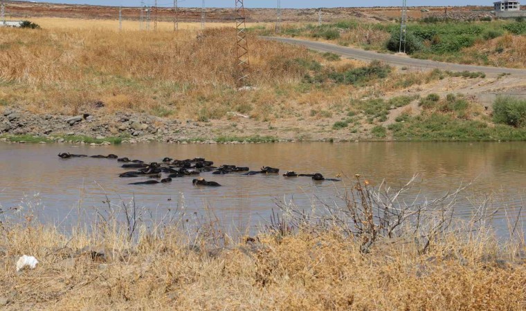 Diyarbakır’ın Bağlar ilçesinde sıcaktan bunalan mandalar, soluğu gölette alarak serinliyor.
