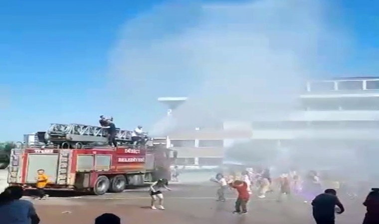 Osmaniye’nin Düziçi ilçesinde bir okulda düzenlenen şenlikte sıcak hava dolayısıyla bunalan öğrenciler, itfaiye tarafından su sıkılarak serinletildi.