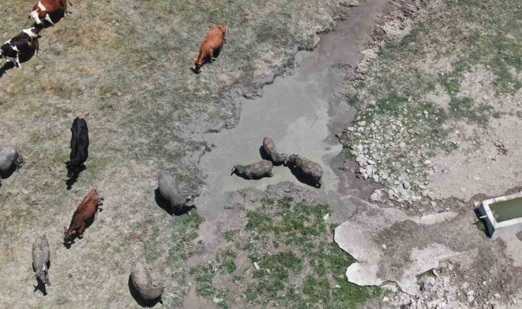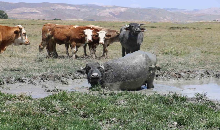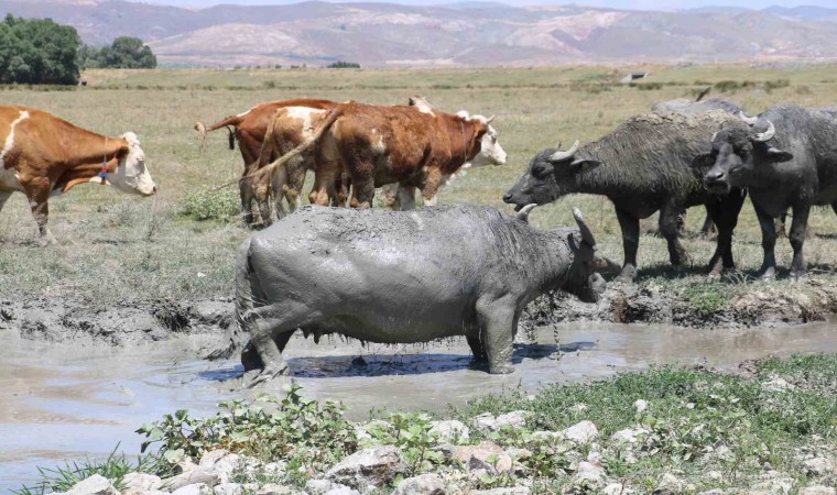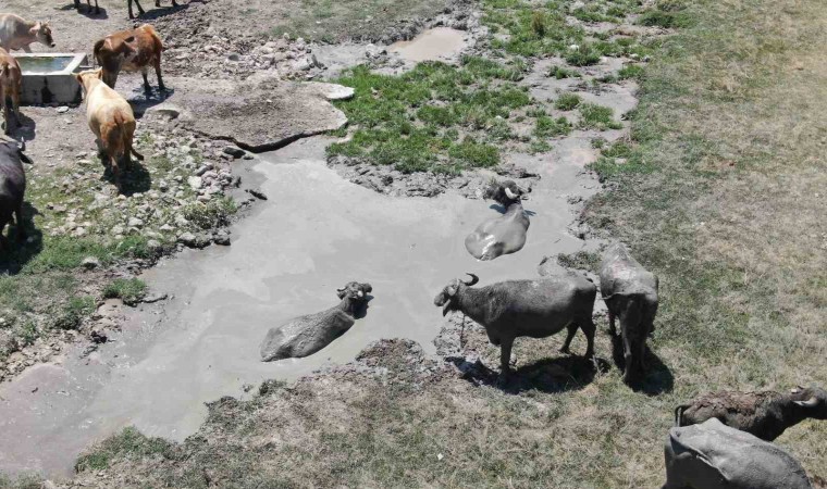 Sivas’ta mevsim normallerinin üzerinde seyreden hava sıcaklıkları mandaları da bunalttı. Serinlemek için sulak alan arayan mandalar çareyi çamur banyosu yapmakta buldu. Mandaların serinlemek için yaptığı çamur banyosu drone ile havadan görüntüledi.
