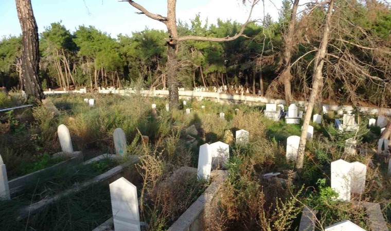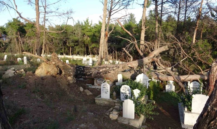 Antalya’nın Manavgat ilçesinde şiddetli fırtına nedeniyle kökünden sökülen dev çam ağacı, çok sayıda mezarın tahrip olmasına neden oldu.
